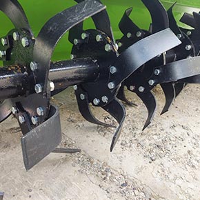 Благодаря широким ножам, надежно закрепленным на цельном роторе с помощью двух болтов, фреза легко справляется с уплотненным и каменистым грунтом.